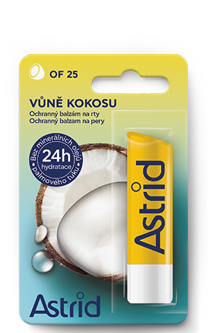 ASTRID VŮNĚ KOKOSU Ochranný balzám na rty je obohacený olejem z avokáda, který je známý obsahem mastných kyselin a vitamínů A, E a D, které pomáhají rtům udržet přirozenou úroveň hydratace. Vůně kokosu evokuje léto a dodává rtům svěží pocit. OF 25 je pomáhá chránit proti UVA a UVB záření.